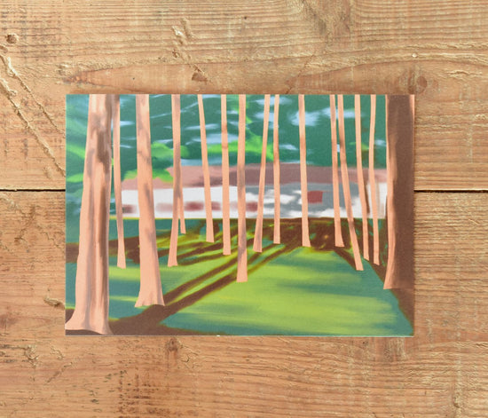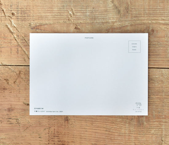旧牛舎の林に日の光が当たっている、静謐な様子を描いたウシノヒロバのオリジナルポストカードです。ウシノヒロバの運営会社Chicabi(チカビ)のデザイナーが制作しました。ご来場頂いた記念にメッセージを添えて、ご家族やご友人へのお手紙などに使用して頂けたら幸いです。